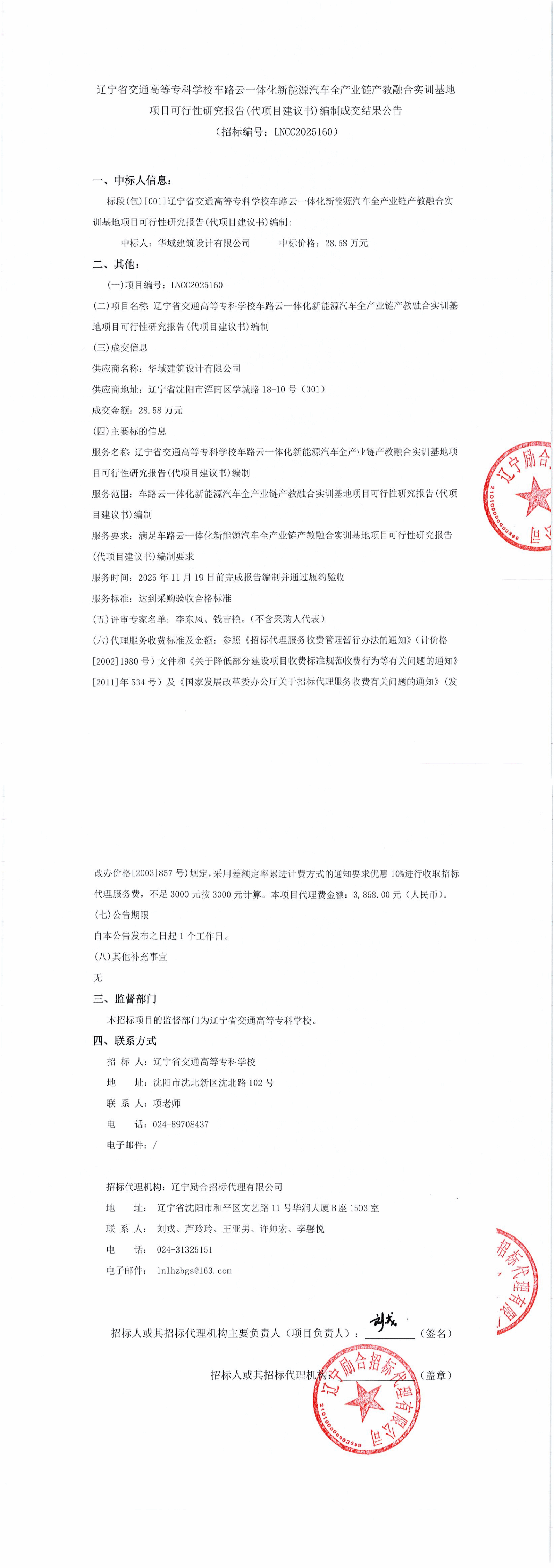 车路云一体化新能源汽车全产业链产教融合实训基地项目可行性研究报告(代项目建议书)编制成交结果公告(LNCC2025160)