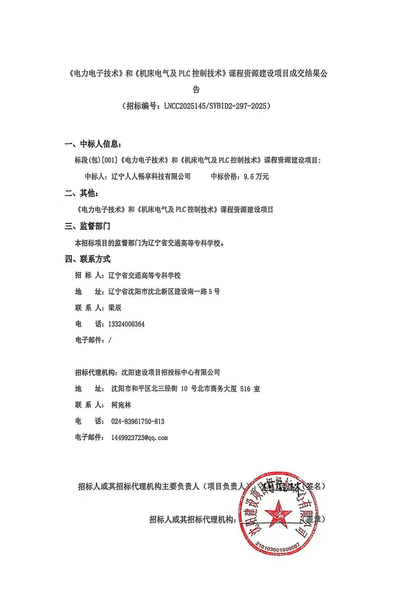 《电力电子技术》和《机床电气及PLC控制技术》课程资源建设项目成交结果公告(LNCC2025145)