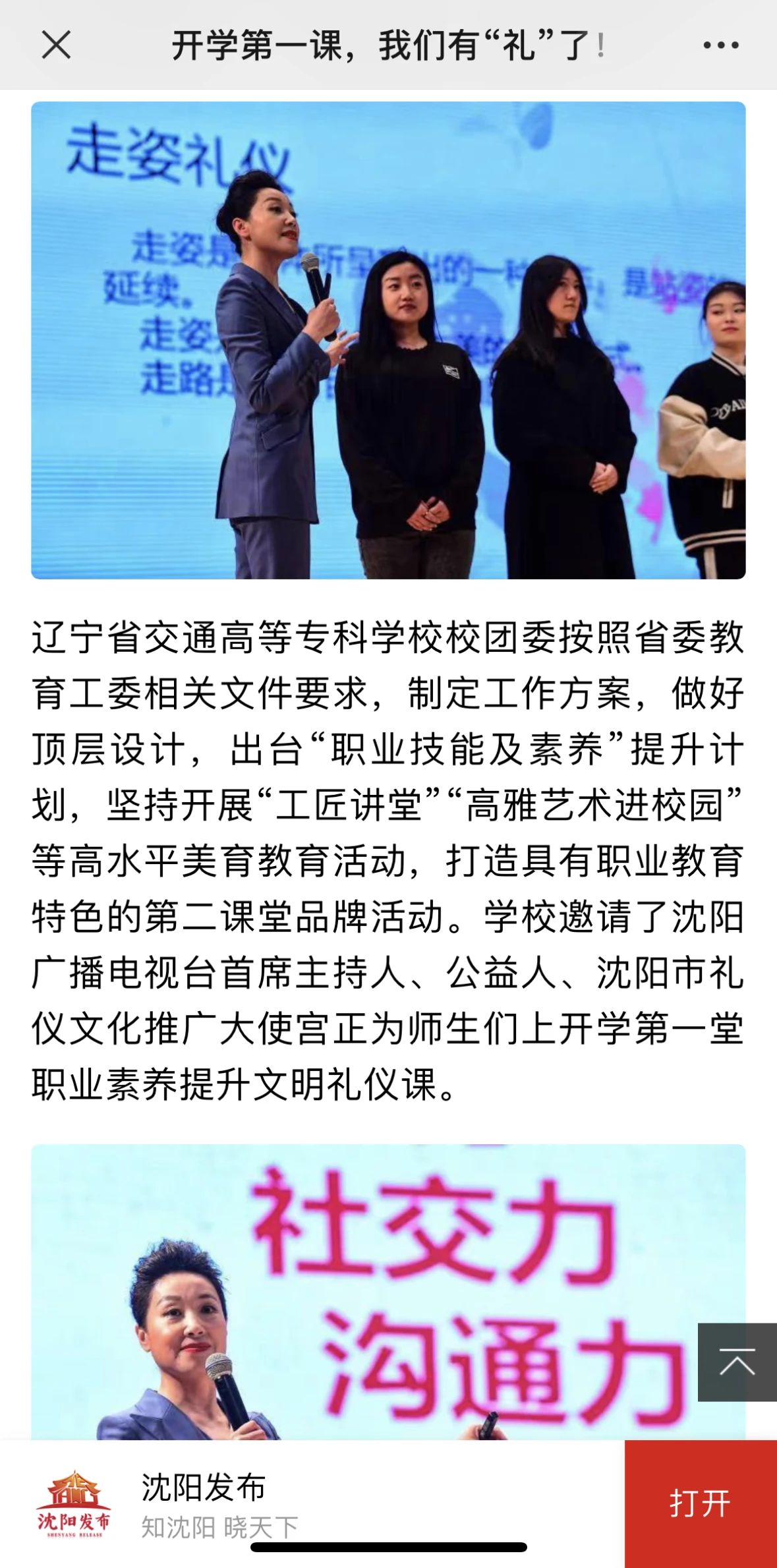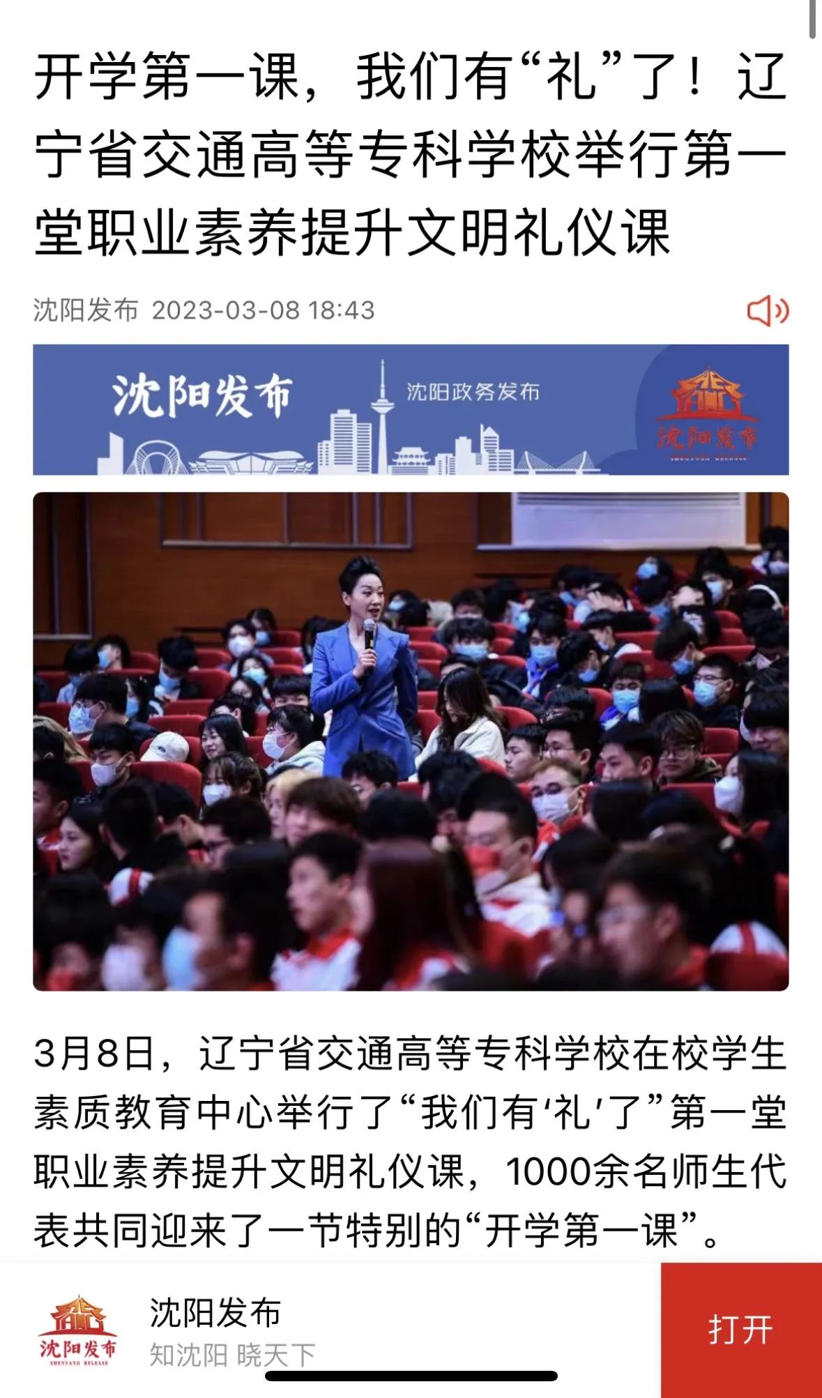 按照中共辽宁省委教育工委、辽宁省教育厅关于组织全省高校上好2023年春季学期“开学第一课”的文件要求,3月8日14:00时,校团委在学生素质教育中心礼堂举行我们有“礼”了——第一堂职业素养提升文明礼仪课。沈阳广播电视台首席主持人、沈阳市文史研究馆研究员、全国三八红旗手、2021中国好人宫正进行现场授课。校团委全体人员、各系团总支书记、各系教师代表及各系学生代表共计一千余名师生出席活动。仪式由校团委干事贾晨阳主持。