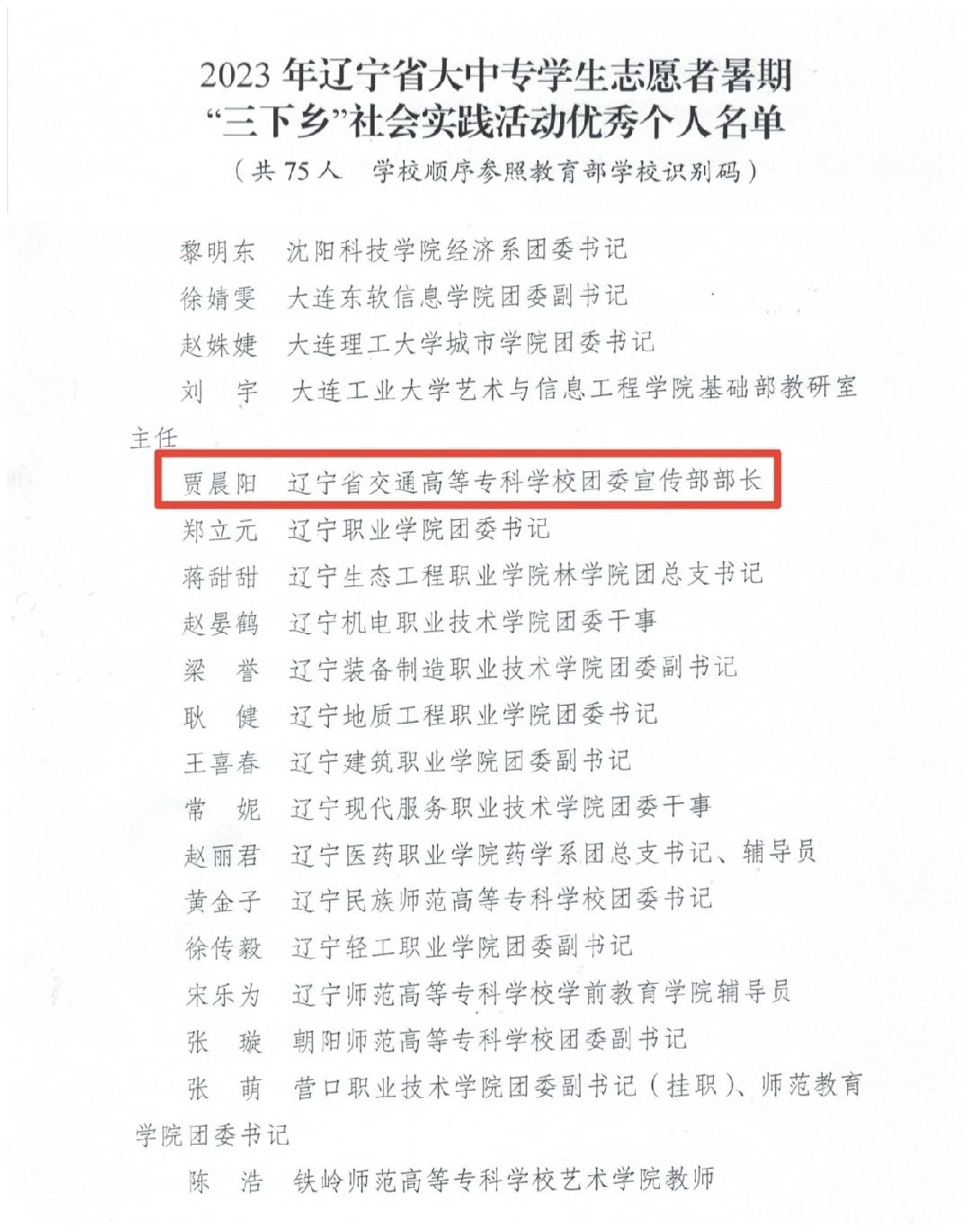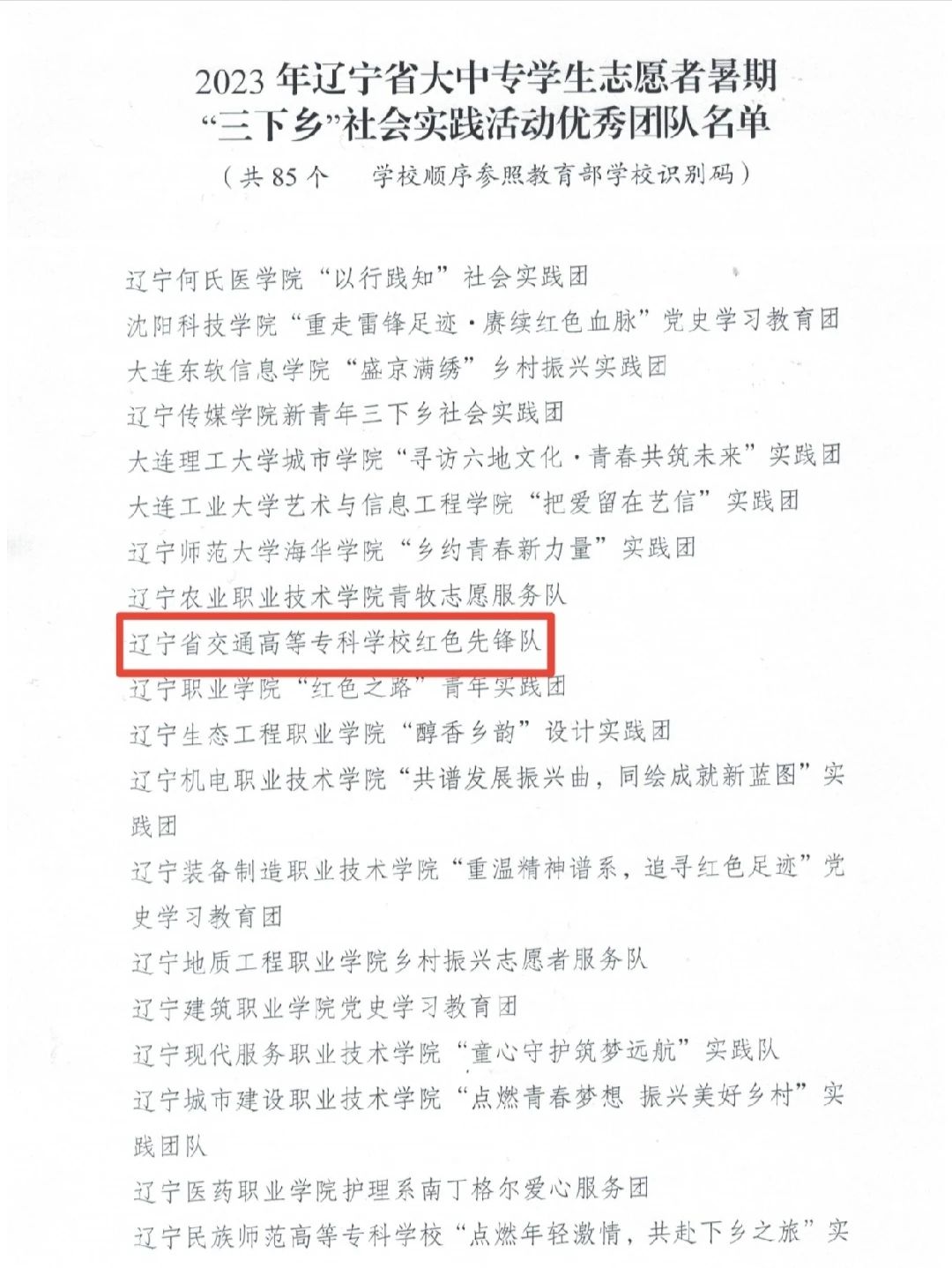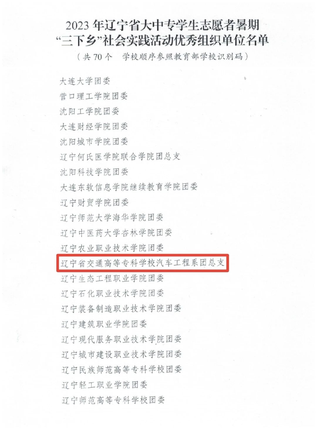 近日,共青团辽宁省委员会发布《关于2023年度辽宁省大中专学生志愿者暑期文化科技卫生“三下乡”社会实践活动通报》,经各市各高校推报,省级团委审核、组织评议等环节,我校汽车工程系团总支被评为优秀组织单位,“红色先锋队”被评为优秀团队,校团委宣传部部长贾晨阳被评为优秀个人。