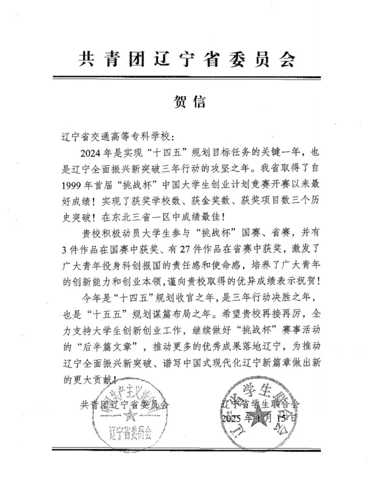 近日,共青团辽宁省委员会致信表扬我校在2024年“挑战杯”中国大学生创业计划竞赛中的突出表现,并为我校取得的优异成绩表示热烈祝贺。