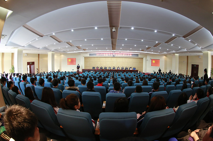 11月21日中午,我校2014年校级学生干部组织成立大会在图书馆学术报告厅举行,校党委副书记岳贵鑫、校团委书记郑海超及各系党总支书记、学工办主任、团总支书记、团总支副书记、学生会主席以及2014届全体校级学生干部共420人参加了本次成立大会,大会由校团委马旸老师主持。