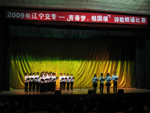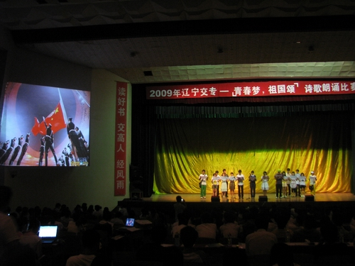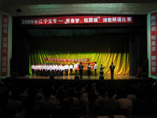 继5月4日爱国主义教育系列活动之2009年辽宁交专 “红歌 红校园”合唱大赛,5月26日,由校团委主办,校广播传媒中心承办的爱国主义教育系列活动之“青春梦 祖国颂”诗歌朗诵比赛在我校礼堂隆重举行。