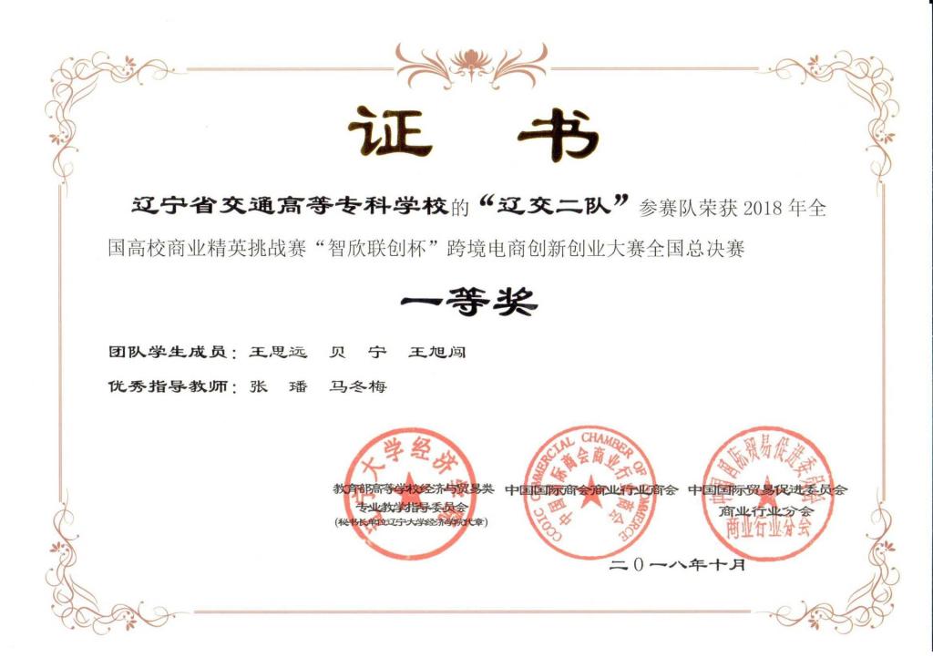 2018年,我系电子商务专业同学鞠瑞、黄俊儒、傅煜超、贝宁,王旭闯、王思远在马冬梅和张璠老师的指导下参加了2018年高校商业精英挑战赛“智欣联创杯”跨境电商创新创业大赛,在全国总决赛中荣获了一等奖的优异成绩!