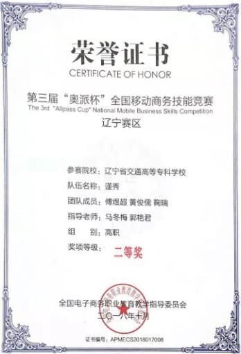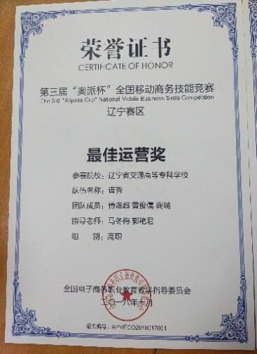 2018年10月27日,我系电子商务专业傅煜超、黄俊儒和鞠瑞三名同学在马冬梅和郭艳君老师的指导下参加了第三届“奥派杯”全国移动商务技能竞赛,获得了省赛二等奖、最佳运营奖、优秀组织单位奖的成绩。