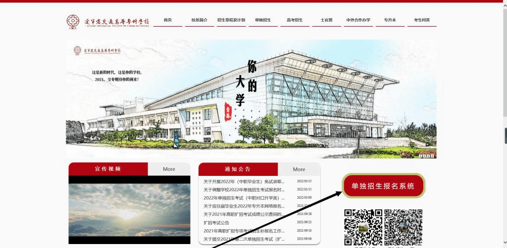 第一步:登录学校官方网站(/),点击图片“2022年招生专栏”进入学校招生网站(或直接登录招生网站:/xsc/)。