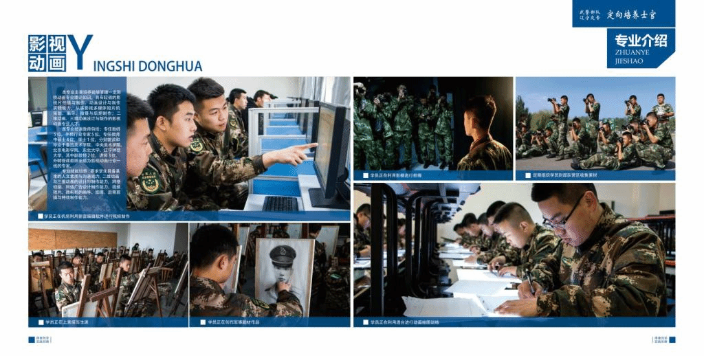就业面向:分配到中国武警部队,从事影视动画专业相关的文化宣传岗位,如摄影记者、部队纪录片/宣传片拍摄与后期制作、PPT与板报设计与制作。部队网络宣传设计制作岗位,如Flash动画制作、三维动画制作、界面设计制作、动态视频设计制作等。