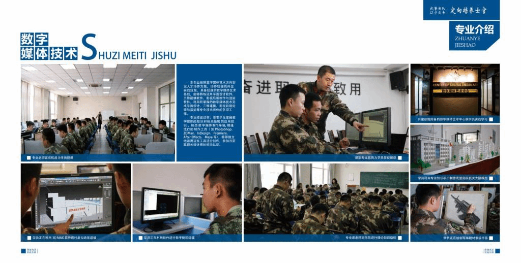 就业方向:分配到中国武警部队,从事数字媒体专业相关的宣传岗位,如新媒体新闻报道、摄影记者、军事新闻制作、展板设计。从事部队网络宣传设计制作岗位,如新媒体推广、短视频制作、网站设计与制作、数字创意建模、虚拟现实交互设计及军事沙盘制作。
