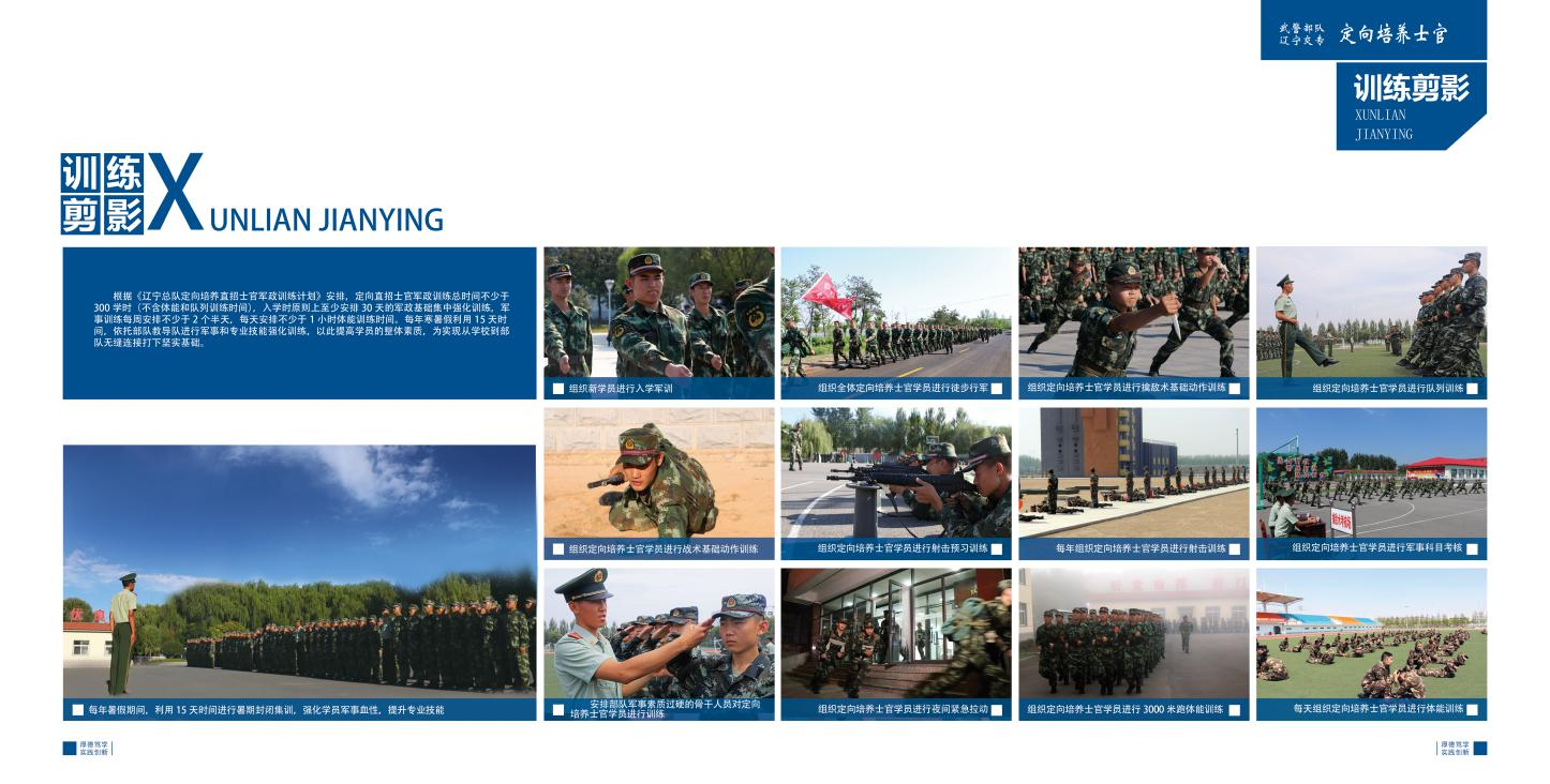 技能培养:根据岗位需求,从第二学期开始,每学期会给大家安排2-3门的课程综合实训。重点提升警士的摄影、摄像、军事展板设计、三维交互、网页设计、视频编辑等能力的提升。利用每年的暑假期间进行为期三周的军队实践,第五学期进行入伍分配及入伍训练,第六学期进行军队专业岗位实习。