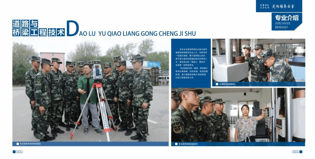 专业技能培养:主要培养学生的道路工程和桥梁工程的测量放样;道路建筑材料的试验检测;道路工程施工及抢通;桥梁工程施工及抢通;隧道工程施工及抢通等专业技能。